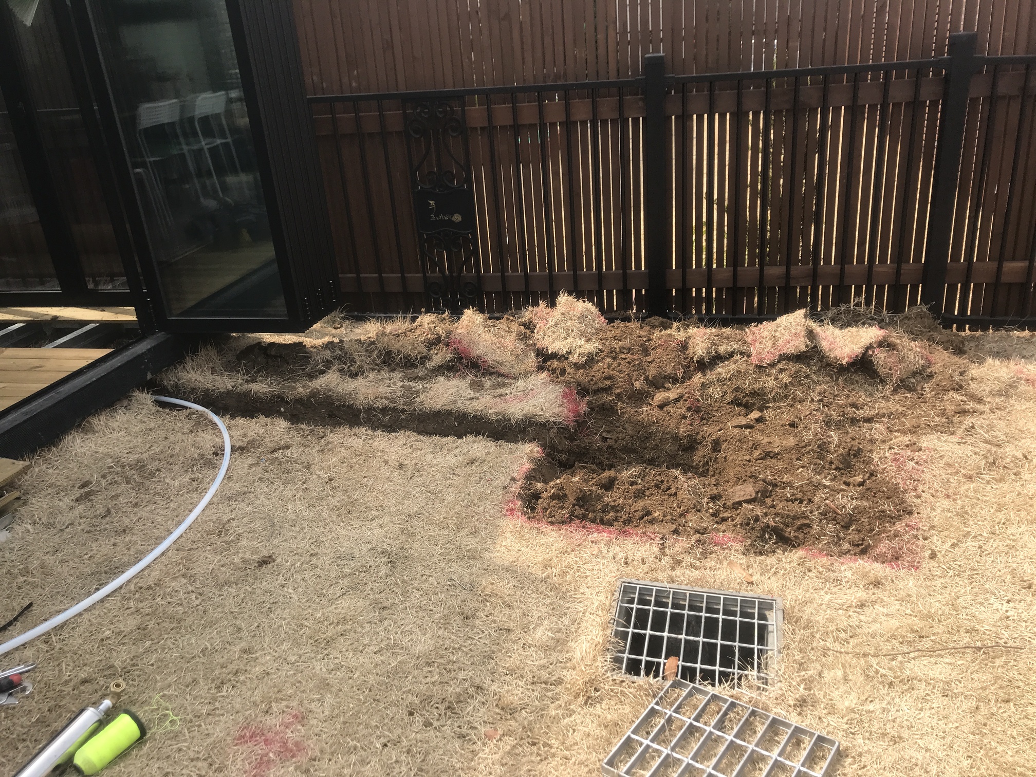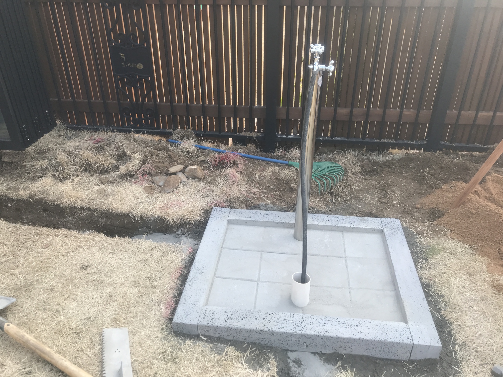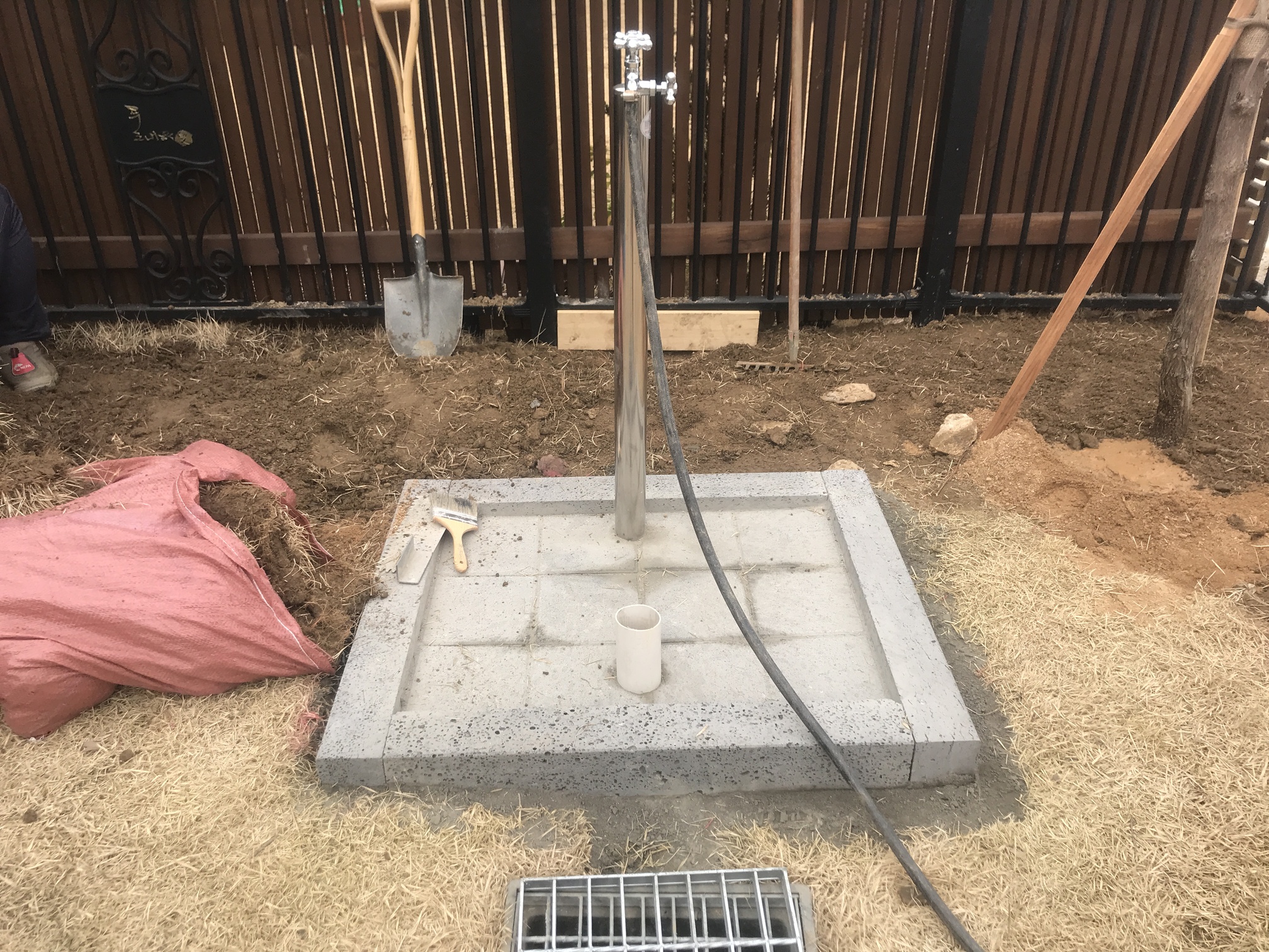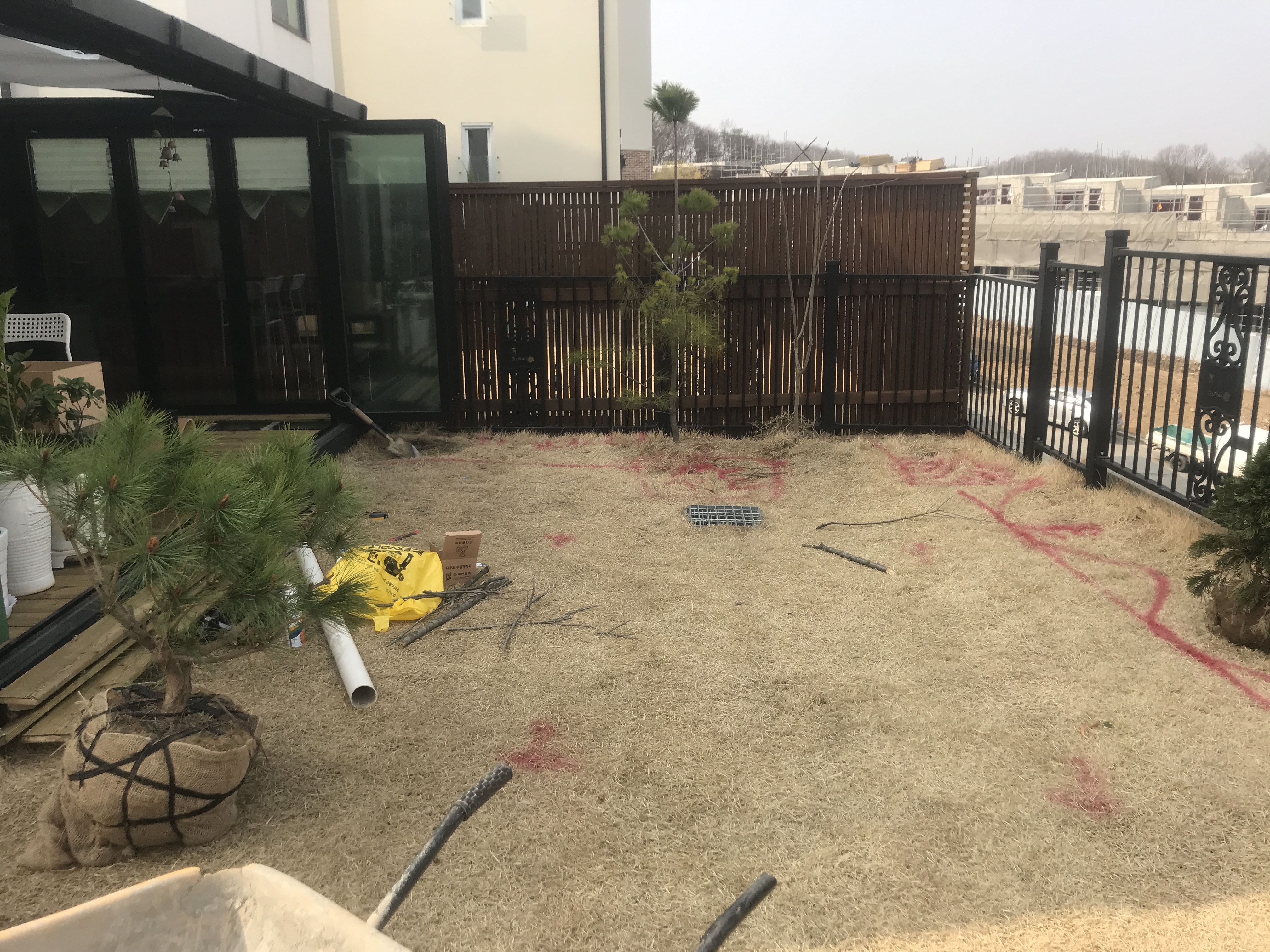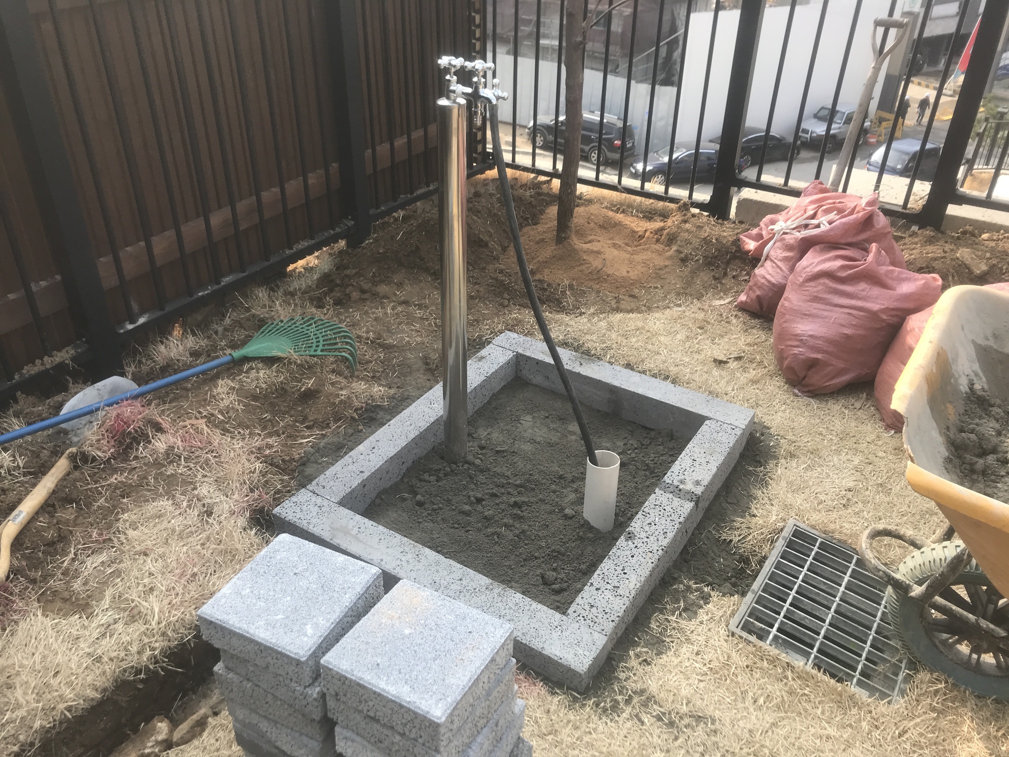 스테인리스 2구 수전주를 세우고, 하부에 화강석 판석으로 세면대 형태의 배수판을 제작하여 설치하였습니다. 배수판 중앙에 배수구를 두어 사용한 물이 바로 빠지도록 하고, 관수 호스와 손 세척 등 정원 작업에 필요한 기능을 한곳에서 해결할 수 있도록 구성하였습니다. 수전주 주변 급수관과 배수관 매설을 마친 뒤 잔디와 마감재로 정리하면, 정원의 실용성과 깔끔한 외관을 동시에 갖춘 수돗가가 완성됩니다.